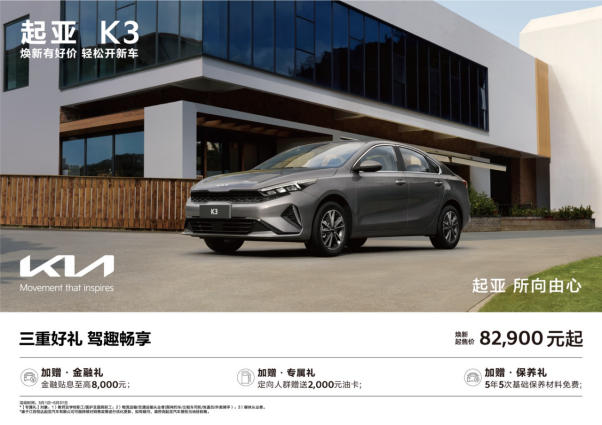 作为一款在产品力、品质方面双双过关的硬核家轿,起亚新K3推出的一系列购车福利,更是让其成为紧凑级轿车的“质价比之王”。5月31日前购车,起亚K3焕新起售价低至82,900元,消费者购车还可加享至高8,000元金融贴息、定向人群赠送2,000元油卡以及5年5次基础保养材料免费等专享权益,可谓将性价比拉满。